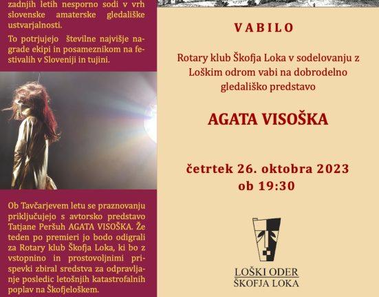 Škofjeloški rotarijci vas vabimo, da se nam pridružite na dobrodelni gledališki predstavi uspešne režiserke Tatjane Peršuh: Agata Visoška, ki jo bo 26.oktobra ob.