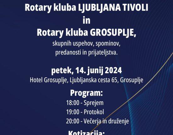 Spoštovani rotarijski prijatelji, z veseljem vas vabimo na skupno praznovanje 20.obletnice Rotary kluba Ljubljana Tivoli in Rotary kluba Grosuplje. Dogodek bo potekal v.