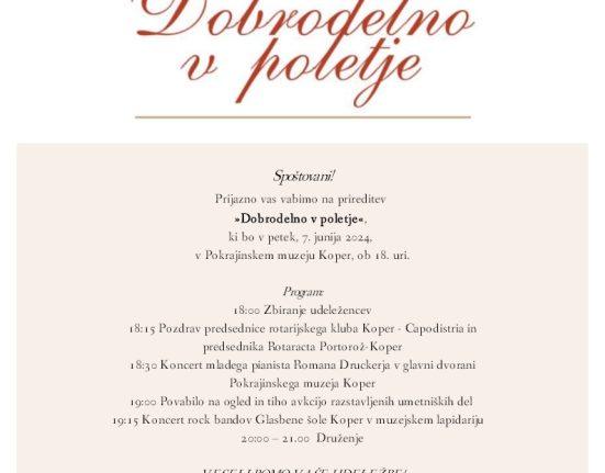 Prijazno vas vabimo na prireditev “Dobrodelno v poletje”, ki bo v petek, 7. junija 2024, v Pokrajinskem muzeju Koper, ob 18. uri. Prireditev.
