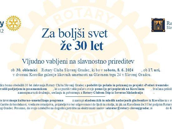 Vljudno vabljeni na slavnostno prireditev ob 30. obletnici Rotary cluba Slovenj Gradec, ki bo v soboto, 8. 6. 2024 ob 17. uri, v dvorani Koroške.