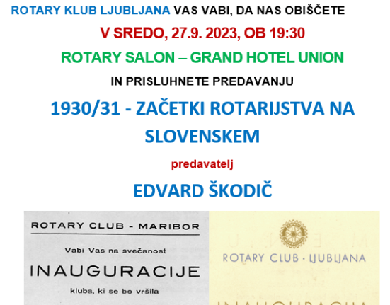 Dragi rotarijski prijatelji. Rotary klub Ljubljana vabi, da jih obiščete v sredo, 27. 9. 2023 ob 19.30, Rotary salon – Grand hotel Union.