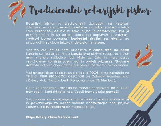 Dragi prijatelji, vljudno vabljeni na tradicionalni “Rotarijski pisker”, ki ga RC Maribor Lent, 21. 10. 2023 ob 9. uri, organizira na Trgu svobode.