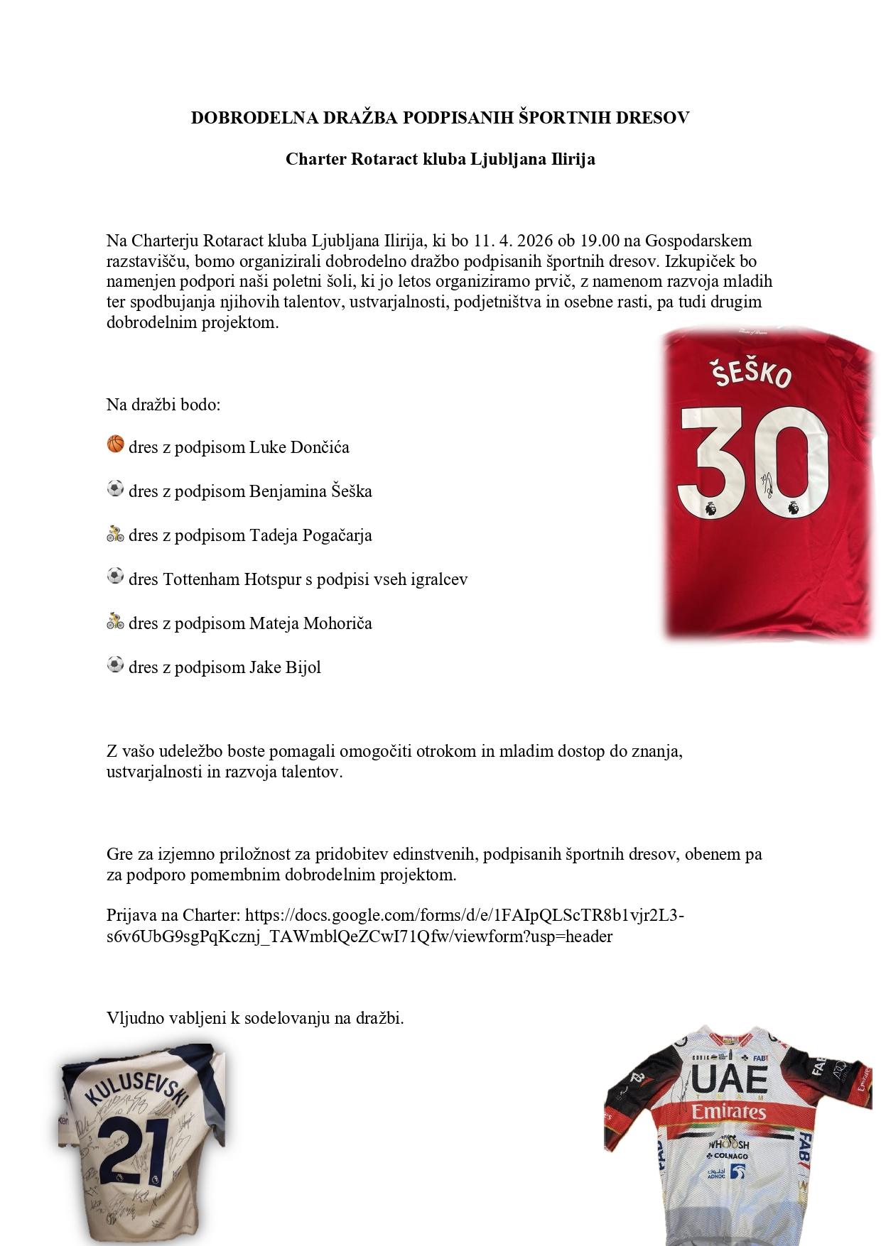 Na Charterju Rotaract kluba Ljubljana Ilirija, ki bo v soboto, 11. 4. 2026 ob 19.00 na Gospodarskem razstavišču, bomo organizirali dobrodelno dražbo podpisanih športnih dresov. Izkupiček bo namenjen podpori naši poletni šoli, ki jo letos organiziramo prvič, z namenom razvoja mladih ter spodbujanja njihovih talentov, ustvarjalnosti, podjetništva in osebne rasti, pa tudi drugim dobrodelnim projektom.