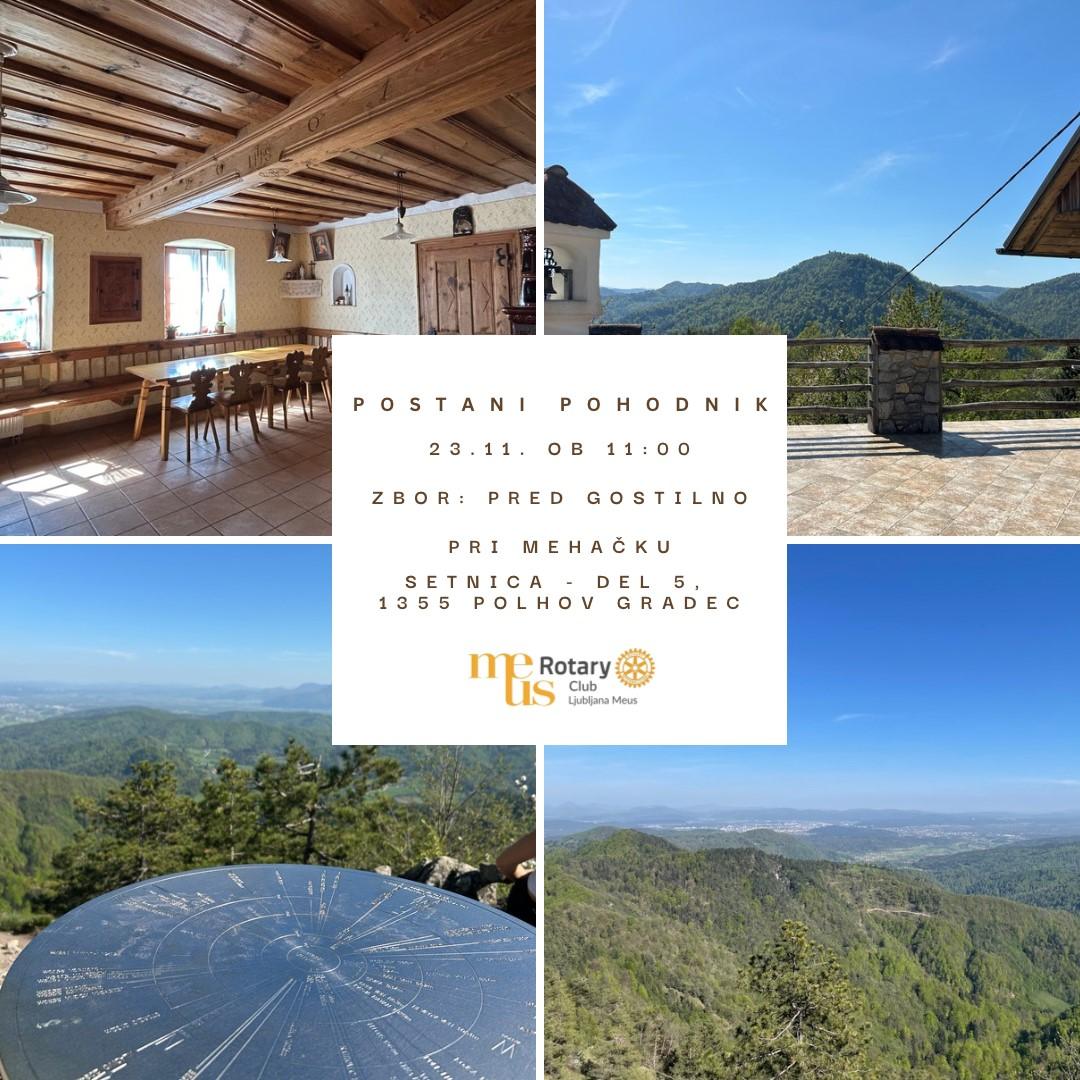 Ob 11:00 se dobimo pred Gostilno pri Mehačku (https://maps.app.goo.gl/my72Ea8bZtzcUjCz6?g_st=ipc, Šetnica – del 5, 1355 Polhov Gradec) in se skupaj povzpnemo na Polhograjsko Grmado (približno 1 ura hoje).