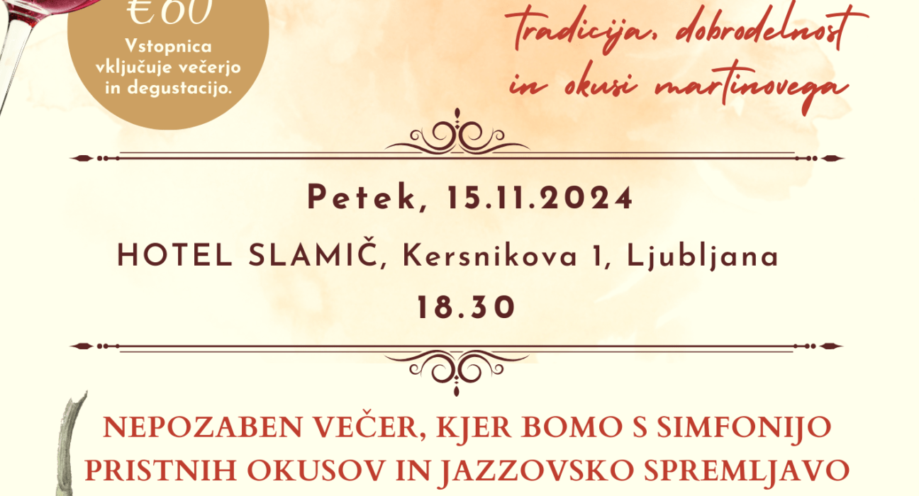Vabimo vas, vaše partnerje in prijatelje, da se nam pridružite na tradicionalnem Martinovem večeru Rotary kluba Ljubljana-Center, ki bo v petek, 15. 11. 2024, ob 18:30 v Hotelu Slamič.