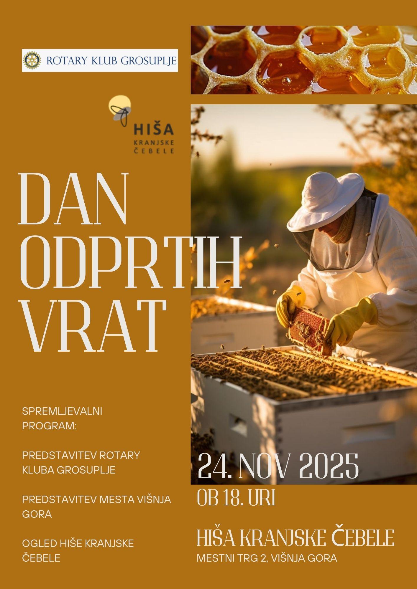 Rotary klub Grosuplje vabi vse rotarijke, rotarijce, prijatelje Rotaryja in širšo javnost na Dan odprtih vrat, ki bo potekal v ponedeljek, 24. novembra 2025, ob 18. uri, v Hiši kranjske čebele, Mestni trg 2, Višnja Gora.