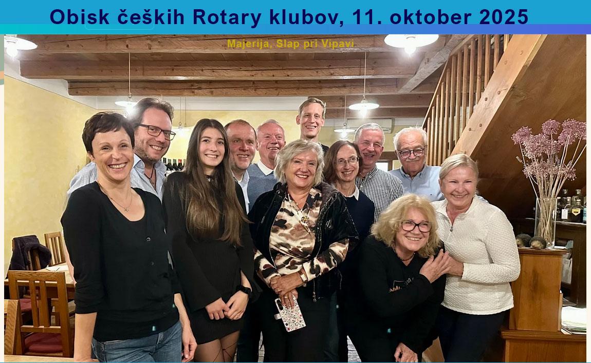 V dneh od 7. do 12. oktobra smo v organizaciji RC Ljubljana Center gostili delegacijo čeških Rotarijcev. Skupaj z njimi smo obiskali Češko kočo, razstavo Slovensko-češka planinska vzajemnost na ljubljanskem Magistratu, Lipico, domačijo Bordon v Dekanih, ogledali smo si lov na tartufe, pršutarno Ščuka, vinsko klet Fedora in Majerijo v vasici Slap.