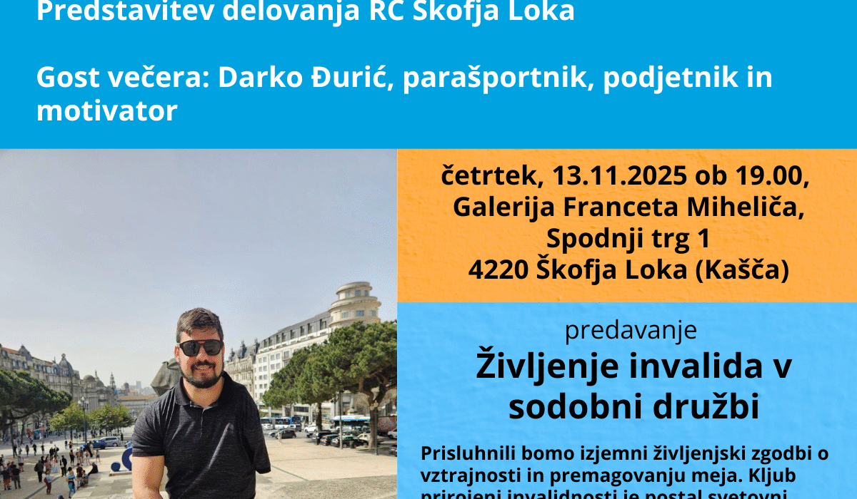 Osrednji gost večera bo Darko Đurić – parašportnik, motivator in rotarijec, ki bo z nami delil svojo edinstveno življenjsko zgodbo. Iz lastnih izkušenj nam bo predstavil:
