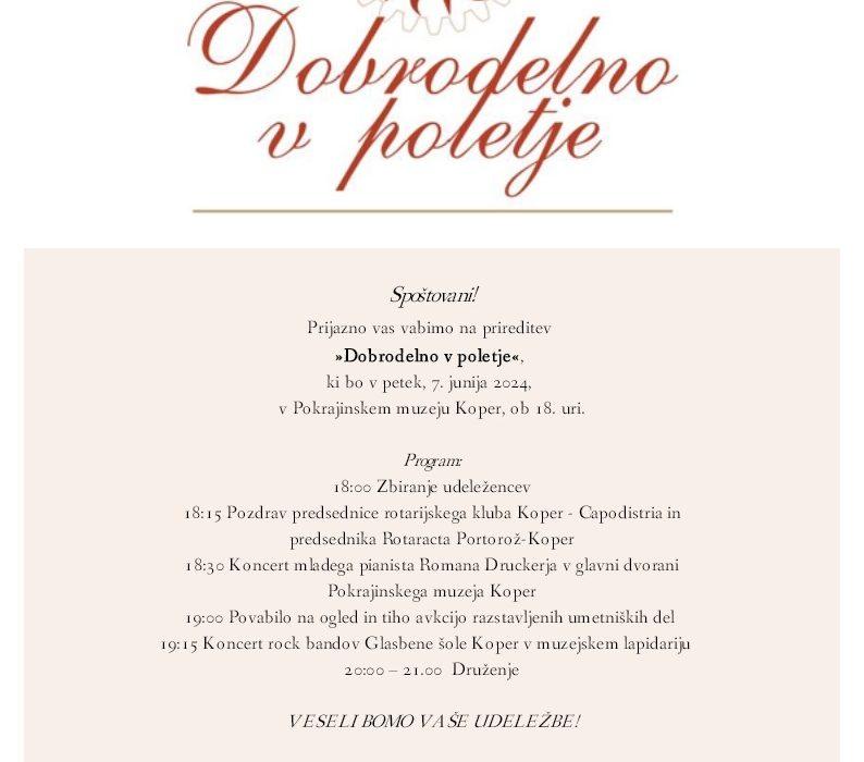 Prijazno vas vabimo na prireditev “Dobrodelno v poletje”, ki bo v petek, 7. junija 2024, v Pokrajinskem muzeju Koper, ob 18. uri. Prireditev organizirata Rotarijski klub Koper – Capodistria in Rotaract Portorož, s ciljem zbiranja sredstev za pomoč lokalni skupnosti.